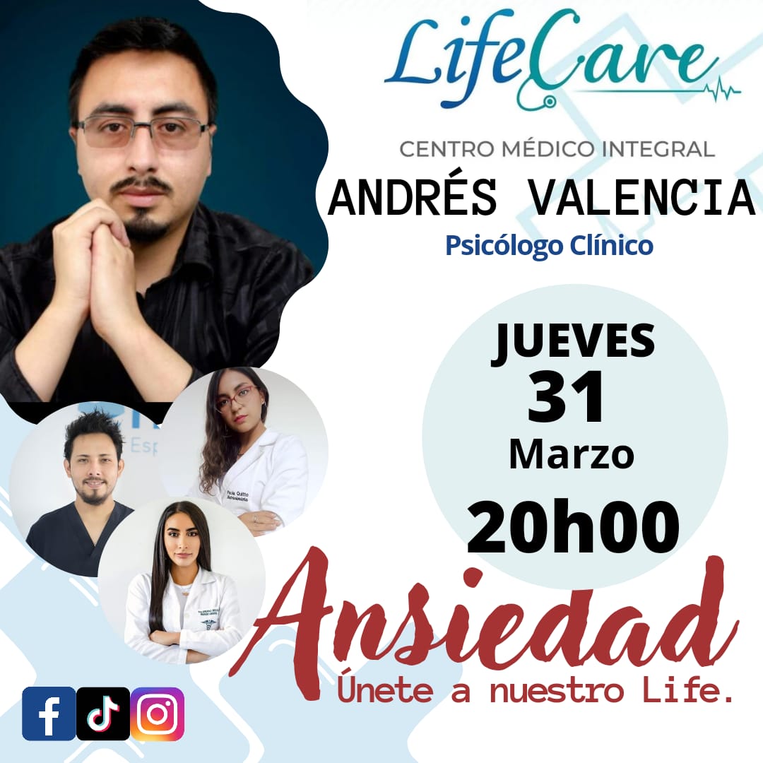 El día jueves 31 de marzo tuvo lugar el facebook live sobre ansiedad gestionado por el CENTRO MEDICO INTEGRAL LIFECARE. Agradezco mucho el espacio, pues fue una experiencia bastante bonita y más al saber que me permite compartir con la comunidad y promocionar la salud mental.