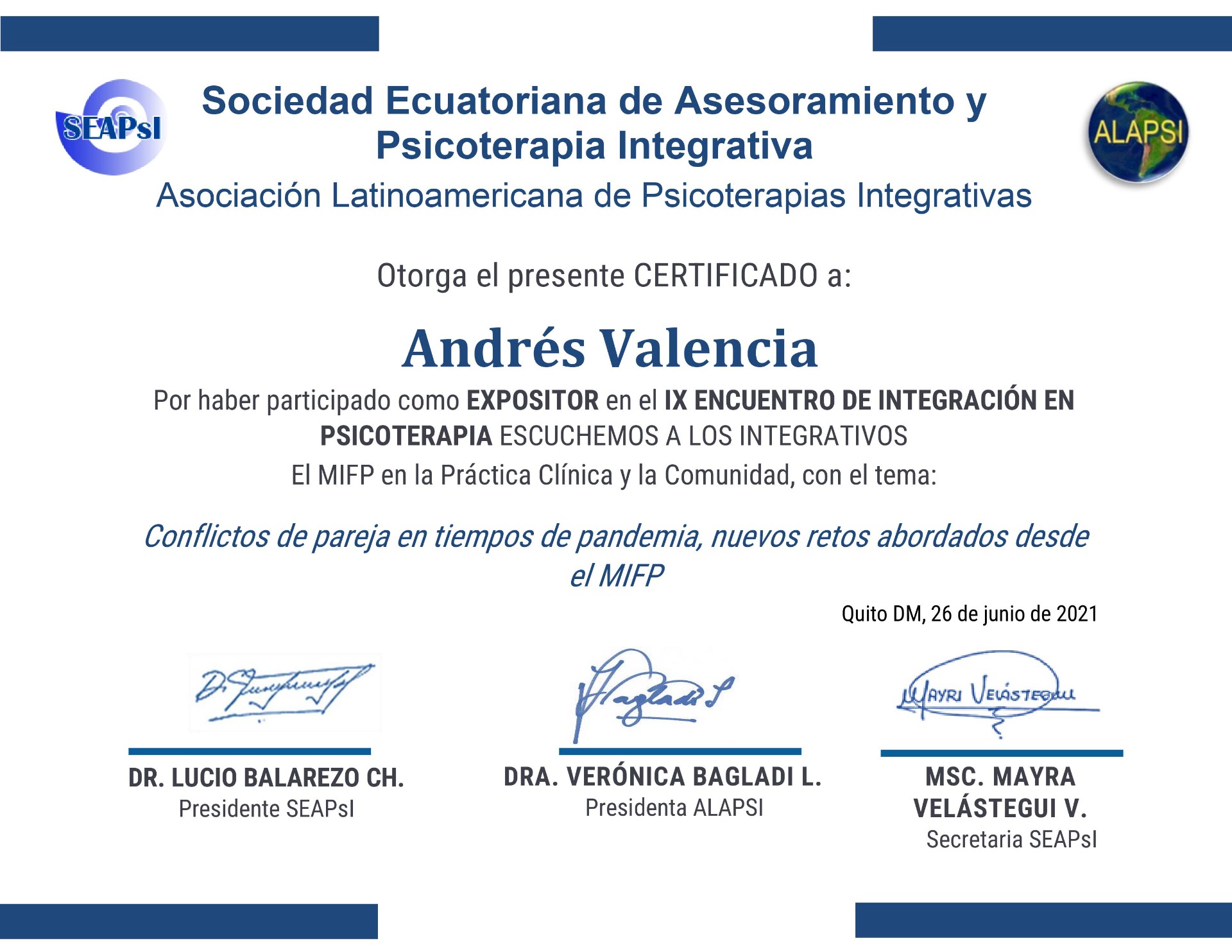 Agradezco la invitación de la Sociedad Ecuatoriana de Asesoramiento y Psicoterapia Ecuatoriana como expositor para el IX Encuentro Ecuatoriano de Integración en Psicoterapia. Gracias por apoyar mi labor y darme la oportunidad de compartir lo que sé con mis colegas